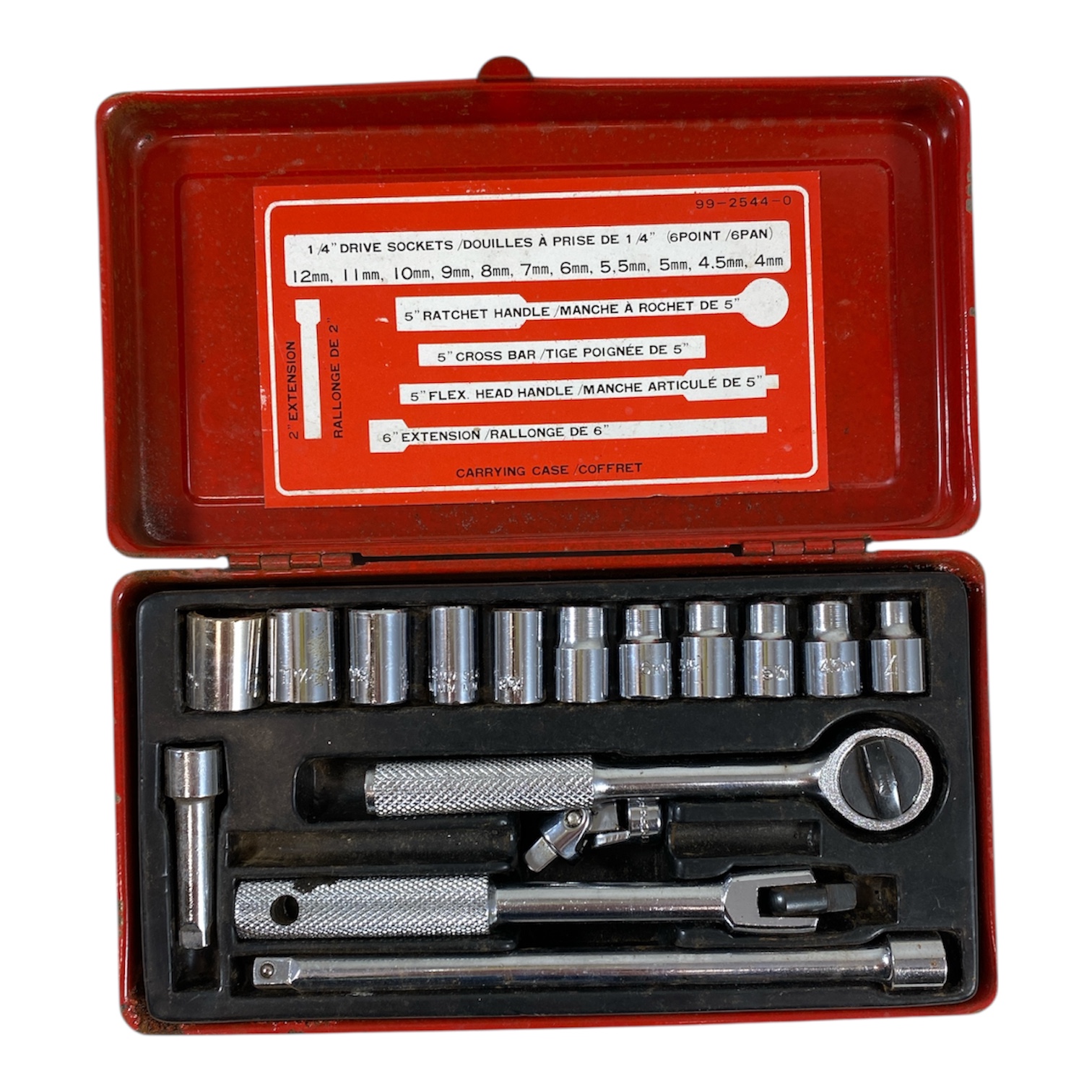 17 piece 1/4″ drive metric socket set includes : 5″ ratchet handle 5″ flex head handle 2″ extension 6″ extension 4, 4.5, 5, 5.5, 6, 7, 8, 9, 10, 11, & 12 mm sockets All tools have been checked and are in good working condition. Pickup during opening hours.